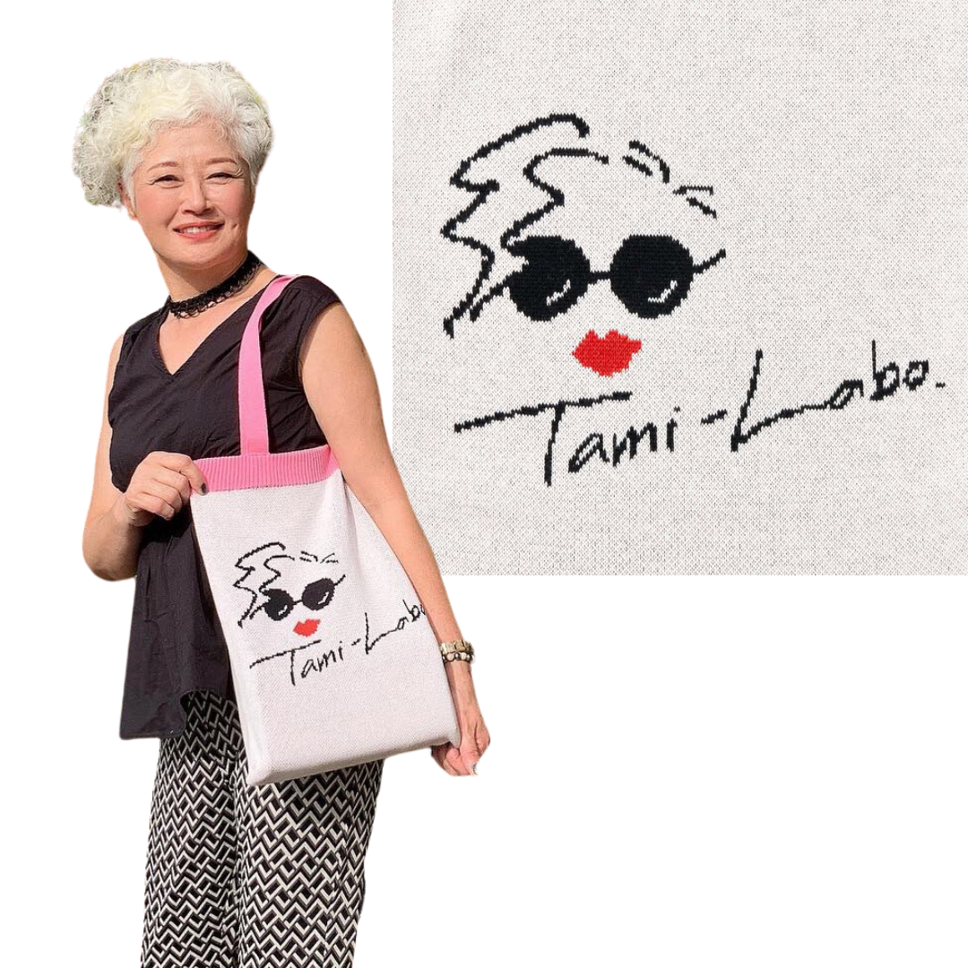 モデルとして活躍されている藤原民子さんの『オリジナル』ニットバッグです。藤原民子さんのオリジナルイラストをお名前入りでデザインされました。ストラップのカラーの差し色はピンクにしてポップな印象に。
